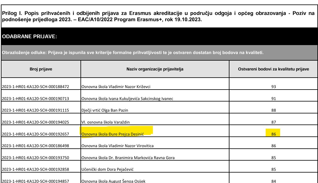 Agencija za mobilnost i programe EU prepoznala je dobar smjer u kojem ciljamo ići te bodovala našu prijavu s 86 bodova, stavljajući nas na 5.mjesto od svih prijavljenih škola. Time je školi dodijeljen status akreditirane ustanove u sklopu Erasmus+ programa što uvelike olakšava pristup sredstvima za provođenje projekata unutar tog programa, od mobilnosti učitelja i stručnih suradnika do grupnih mobilnosti učenika.